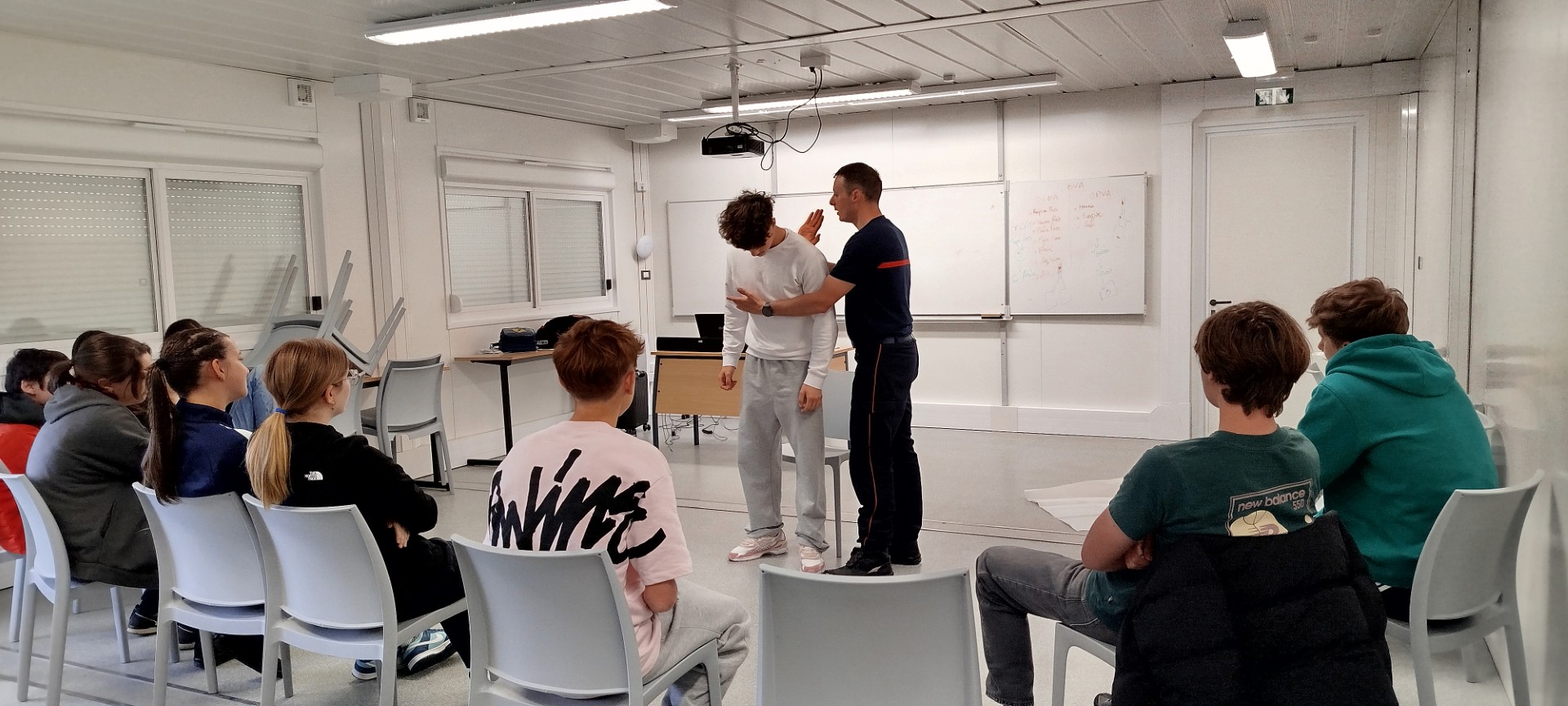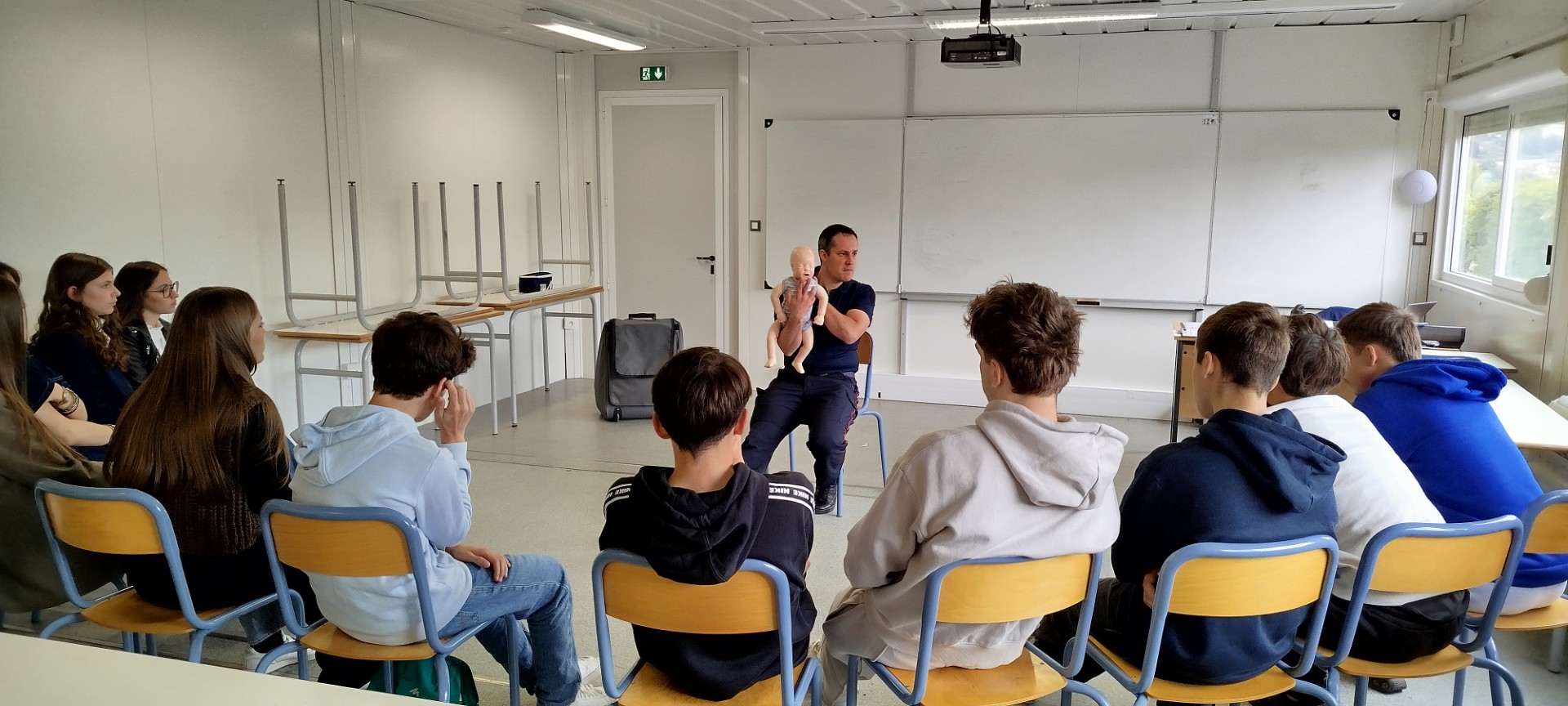Les formation de l'UDSP interviennent directement au sein du lycée, dans des salles de classe, avec leur matériel de formation. A la fin de la journée, le groupe d'élèves sait protéger, alerter et secourir.