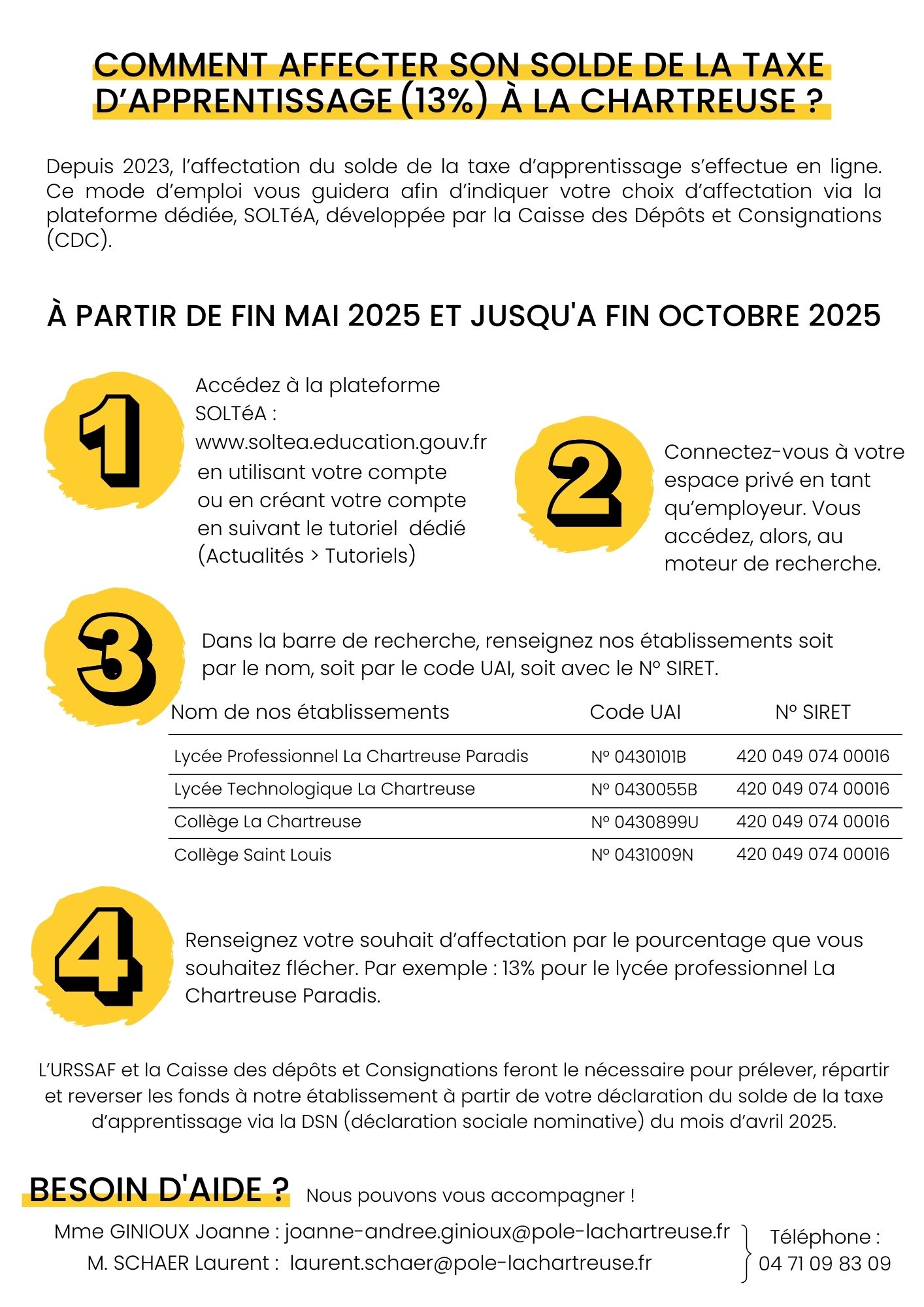 Depuis mai 2023, pour affecter le solde de la taxe d’apprentissage (appelé également le 13%) à nos établissements du Pôle La Chartreuse, il faut utiliser la plateforme SOLTéA. www.soltea.education.gouv.fr